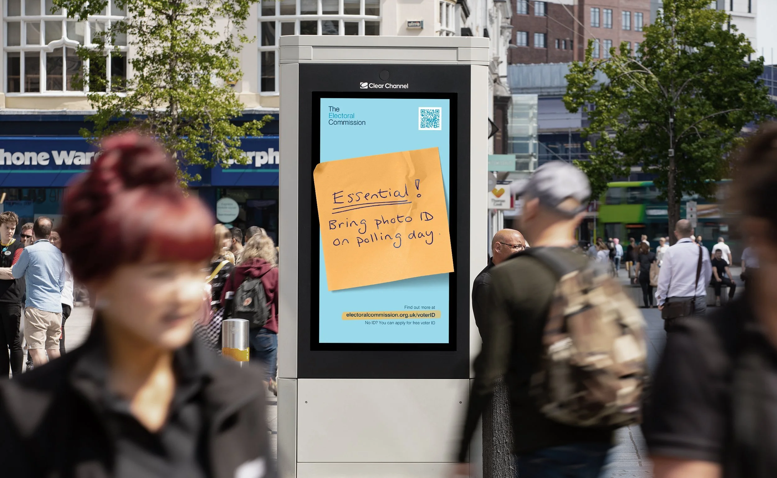 May 2023 saw legislation from the UK Government where voters were required to show an accepted form of photo ID at polling stations in order to vote. The campaign, ‘Note to Self’, ran across TV, OOH, radio, digital audio, social, digital display, print and in-game. The creative featured people encountering giant sticky notes as a personal reminder.